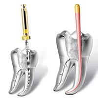 Endodontic therapy or root canal therapy is a sequence of treatment for the infected pulp of a tooth which results in the elimination of infection and the protection of the decontaminated tooth from future microbial invasion. Root canals and their associated pulp chamber are the physical hollows within a tooth that are naturally inhabited by nerve tissue, blood vessels and other cellular entities which together constitute the dental pulp. Endodontic therapy involves the removal of these structures, the subsequent shaping, cleaning, and decontamination of the hollows with small files and irrigating solutions, and the obturation (filling) of the decontaminated canals with an inert filling such as gutta-percha and typically a eugenol-based cement. Epoxy resin, is employed to bind gutta-percha in some root canal procedures.